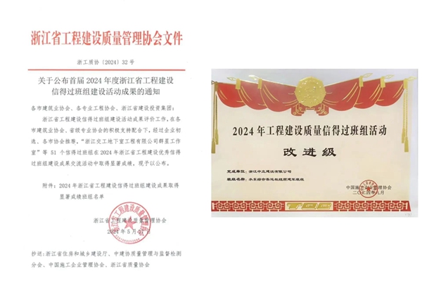在2024年度工程建設(shè)質(zhì)量信得過班組比賽中,我公司水東樞紐項(xiàng)目團(tuán)隊(duì)獲得浙江省建設(shè)成果取得顯著成績班組和中國施工企業(yè)管理協(xié)會(huì)《2024年度工程建設(shè)質(zhì)量信得過班組改進(jìn)級》。