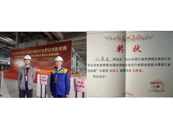 公司員工劉益君參加2024年浙江省住房城鄉(xiāng)建設(shè)行業(yè)職業(yè)技能競賽暨全國住房城鄉(xiāng)建設(shè)行業(yè)職業(yè)技能大賽中,榮獲“鋼筋工競賽項(xiàng)目優(yōu)勝獎(jiǎng)”。