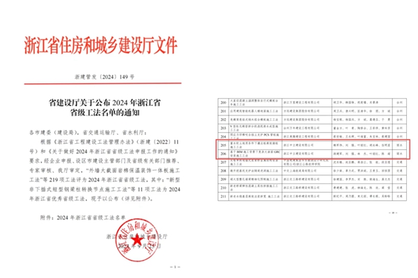 在2024年浙江省省級工法評選中,“富水軟土地質(zhì)條件下灌注樁高效接樁施工工法”與“基于BIM技術(shù)復(fù)雜大曲面GRC安裝施工工法”2項(xiàng)工法榮獲浙江省省級工法。