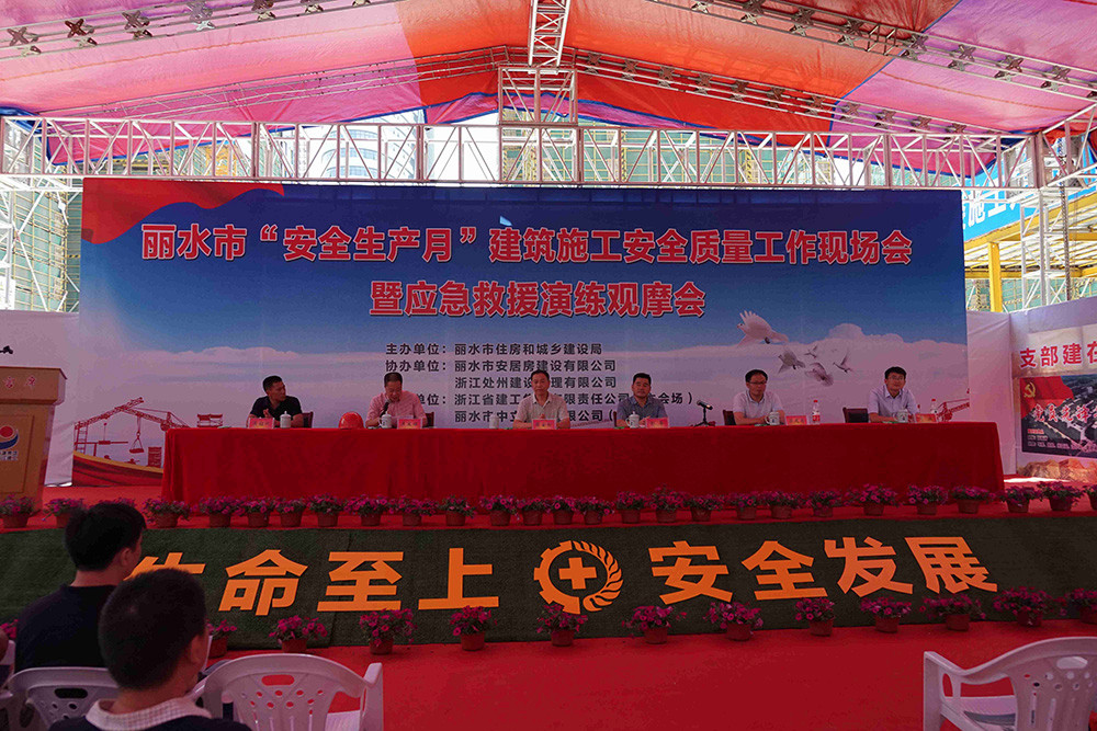 6月15日上午,麗水市住房和城鄉(xiāng)建設局召開麗水市“安全生產(chǎn)月”建筑施工安全質量工作現(xiàn)場會暨應急救援演練觀摩會,我公司承建的麗水市人民醫(yī)院東城院區(qū)項目部為本次會議的觀摩現(xiàn)場、公司副總經(jīng)理吳韶斌代表施工單位在大會上作交流發(fā)言。