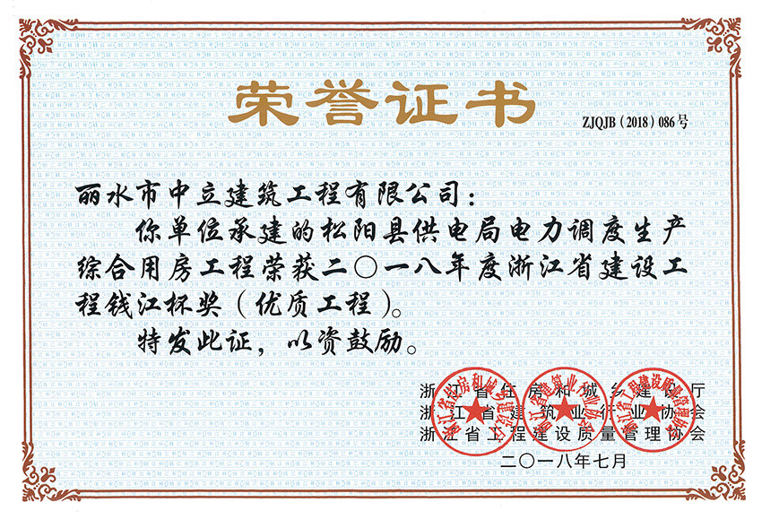 喜報(bào)!近日,省建設(shè)廳頒發(fā)了2018年度浙江省建設(shè)工程“錢江杯”(優(yōu)質(zhì)工程)文件,我公司“麗水市體育館體育中心工程、松陽縣供電局電力調(diào)度生產(chǎn)綜合用房工程”分別獲得2018年度“錢江杯”(優(yōu)質(zhì)工程)獎(jiǎng)。