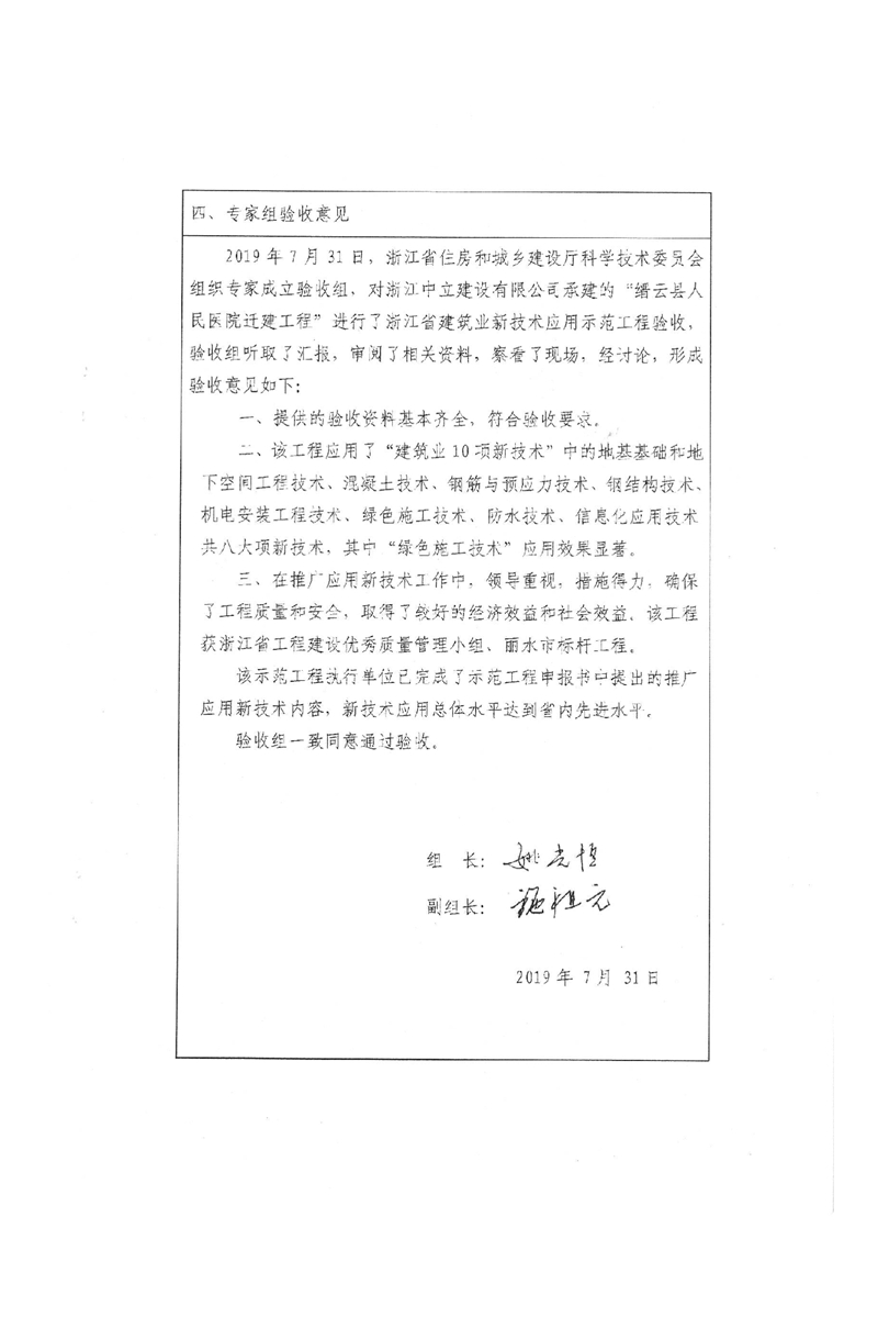 我公司承建的“縉云縣人民醫(yī)院遷建工程”通過了浙江省建筑業(yè)新技術應用示范工程驗收。該工程是我公司也是麗水市本地企業(yè)首次榮獲浙江省建筑業(yè)新技術應用示范工程,取得了較好的經(jīng)濟效益和社會效益。通過開展技術創(chuàng)新活動是我公司提升企業(yè)知名度,提高整體技術管理水平,鍛煉隊伍培養(yǎng)人才的重要途徑。